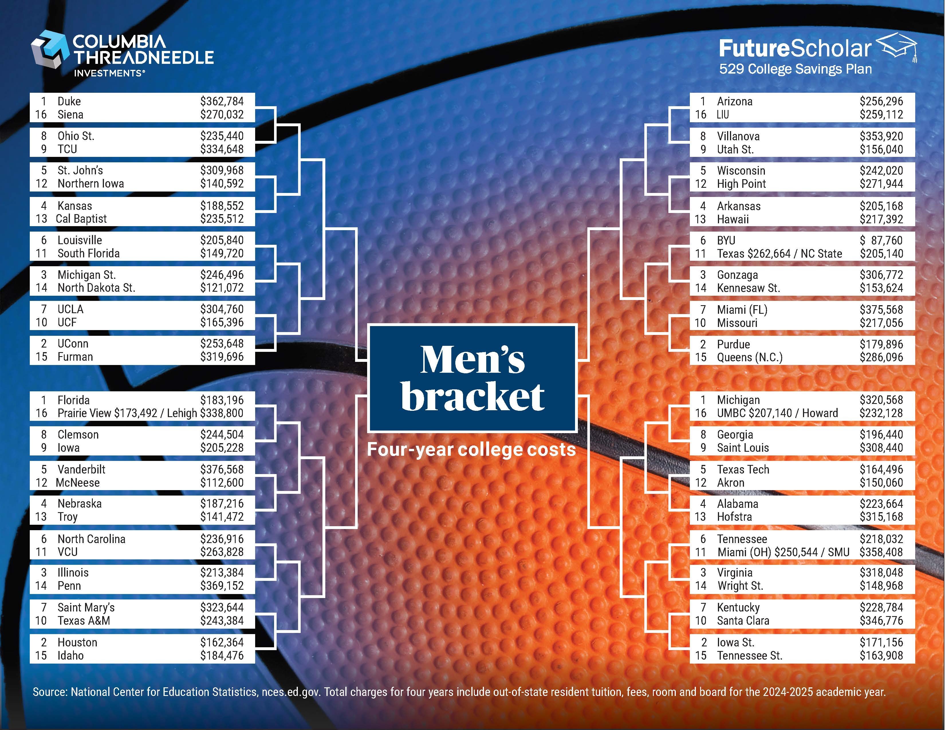 And just like a tournament run ends in a single game, college costs can swing dramatically depending on the school you choose and the plan you build ahead of time.