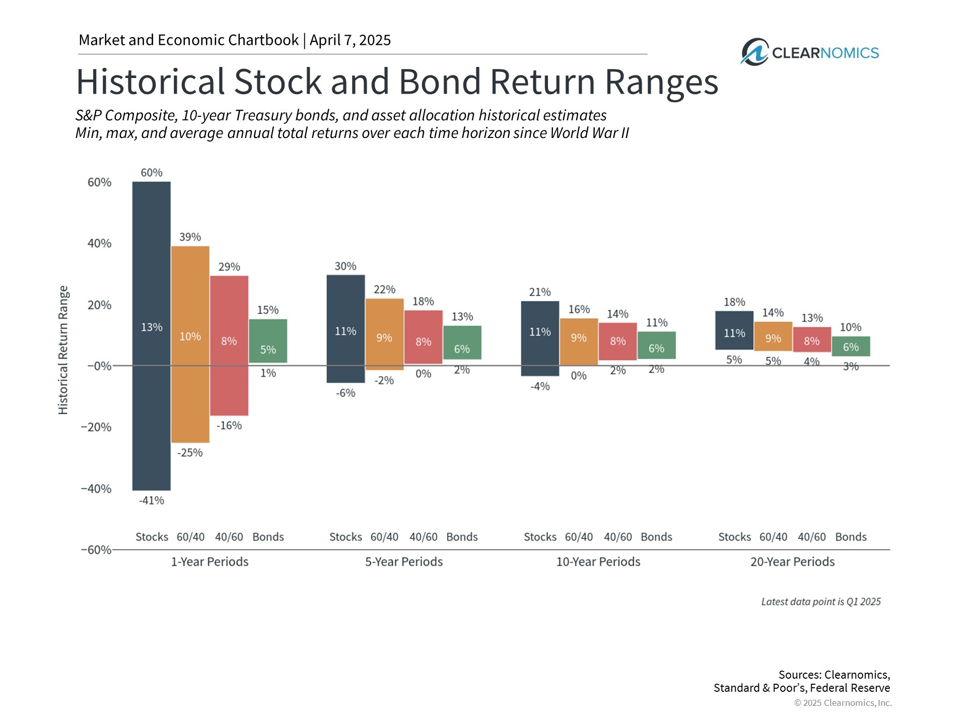Two of the key principles of long-term investing are diversification and maintaining a long time horizon. This is showcased in the accompanying chart which depicts the range of historical outcomes across stocks, bonds, and diversified portfolios. It also shows how these ranges change when time horizons are increased. For instance, it’s easy to see that over just one-year periods, the stock market can vary significantly, from gaining 60% in 1983 when the market recovered from stagflation fears, to -41% during the global financial crisis.